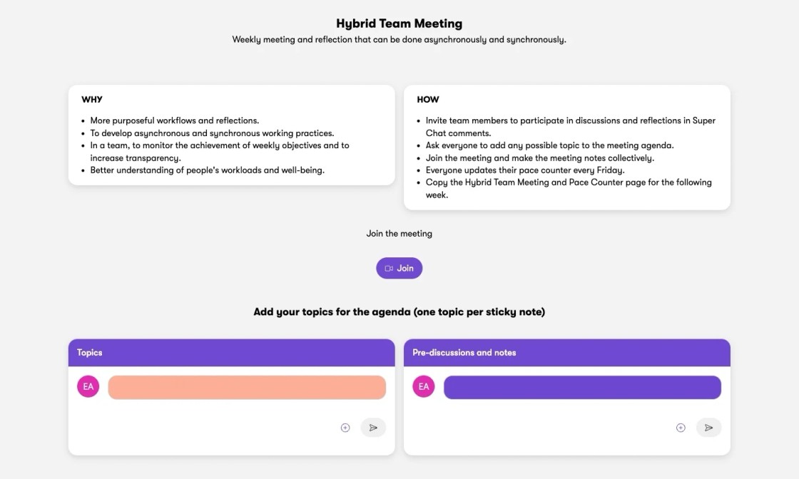 Everyone updates their pace counter every Friday to a meeting page. Team members are then invited to participate in discussions and reflections in Super Chat comments. Everyone should have the chance to add topics they want to talk about to the meeting agenda. Then simply duplicate the meeting page in your workspace for the following week.