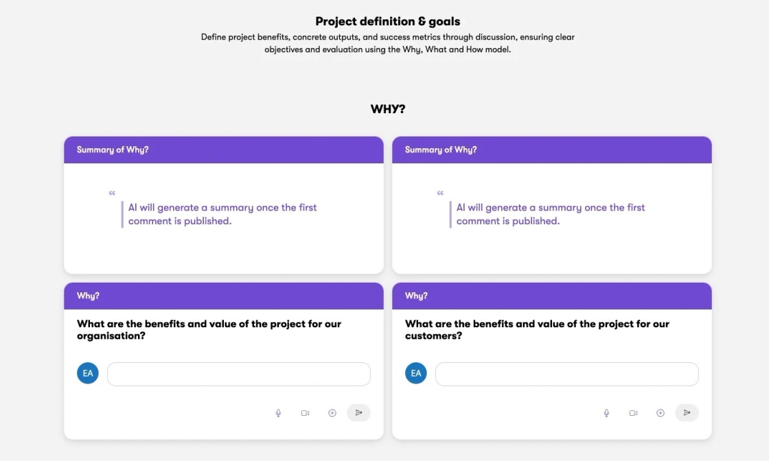 Our Project Definition & Goals Template is designed to simplify and enhance your project planning process. By using a structured approach based on the Why, What, and How model, you can clearly define your project's benefits, outputs, and success metrics. This tool is equipped with advanced AI capabilities to help you synthesize and articulate your goals effectively, ensuring that your project is well-organized and strategically planned.