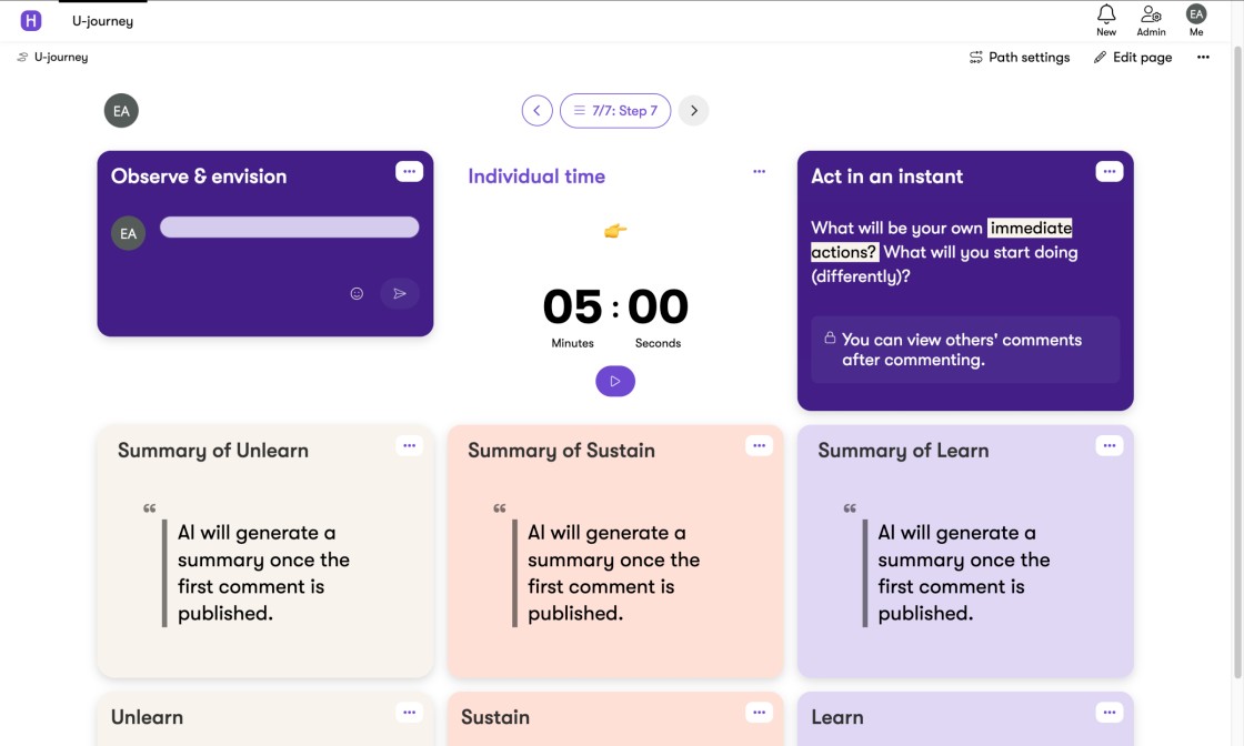 This template is based on U-theory by Otto Scharmer. Theory U is a change management method and the title of a book by Otto Scharmer. At Howspace, we've developed an adapted version of the method that's proven useful for focusing, prioritizing, and identifying and defining a needed change.