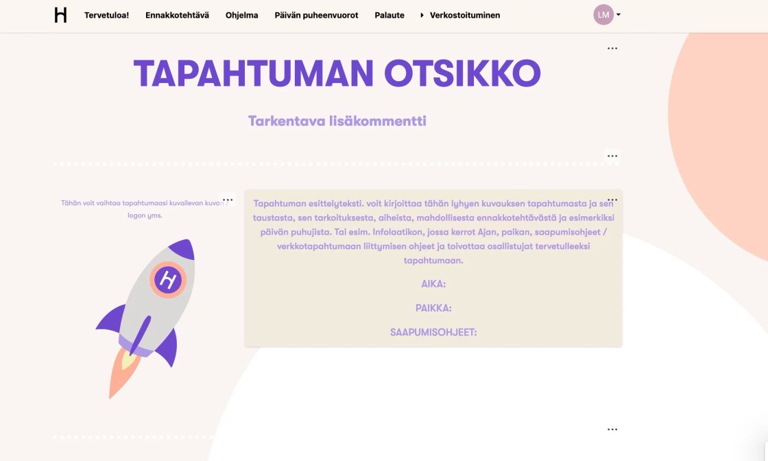 Tarjoamme käyttöösi yksinkertaisen maillipohjan, jolla luot helposti koko tapahtumaprosessin Howspaceen. Löydät tapahtuman eri osa-alueet helposti mallipohjan ylävalikosta ja voit poistaa tarpeettomat sivut tai kopioida haluamasi sivut oman työpajasi työtilaan.